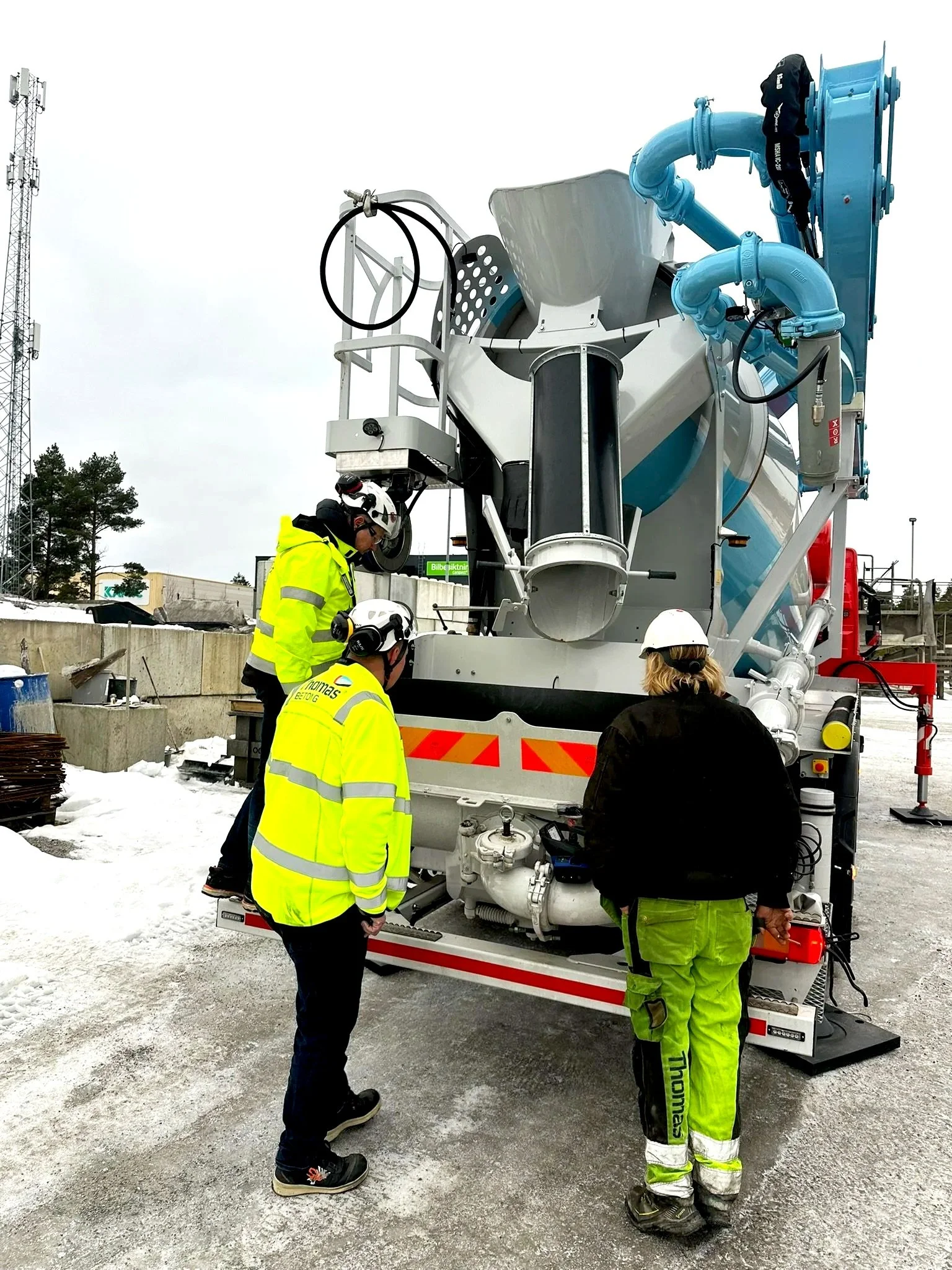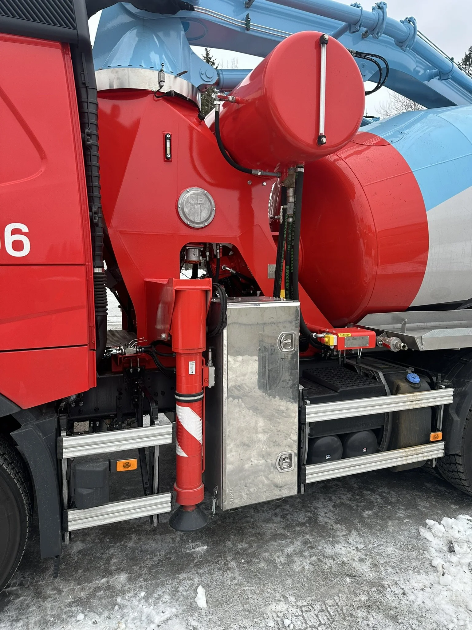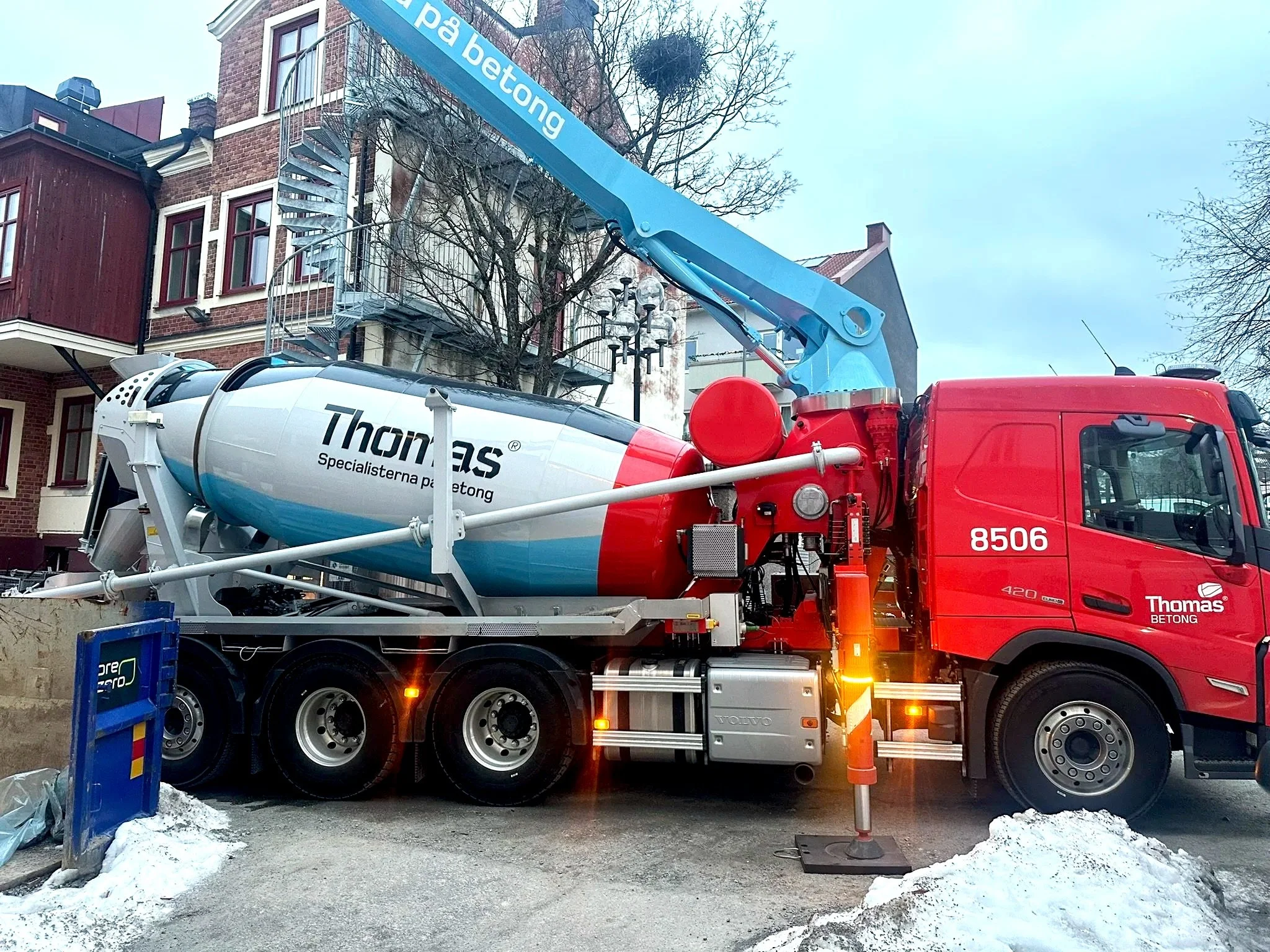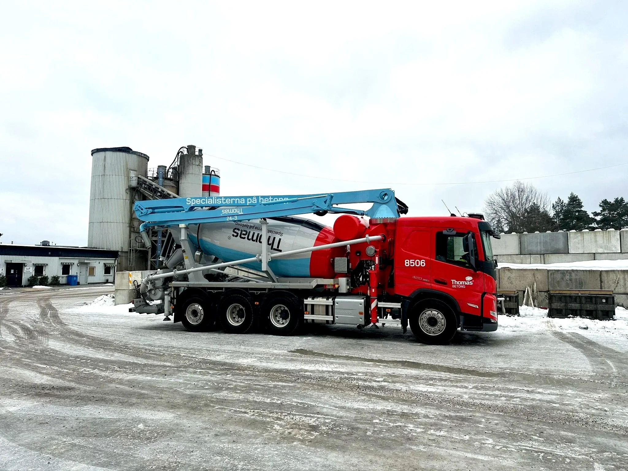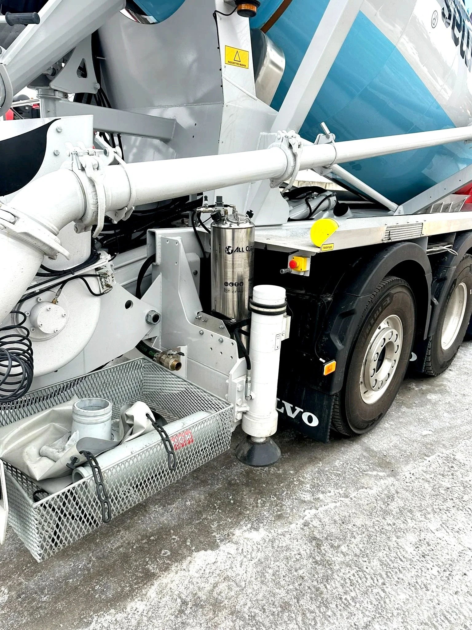Betongpumpen har en pumpkapacitet på 80m3/timme och 65bar betongtryck. Hydraulikomponenter från BoschRexroth och en trumma med nominell kapacitet 9m3.